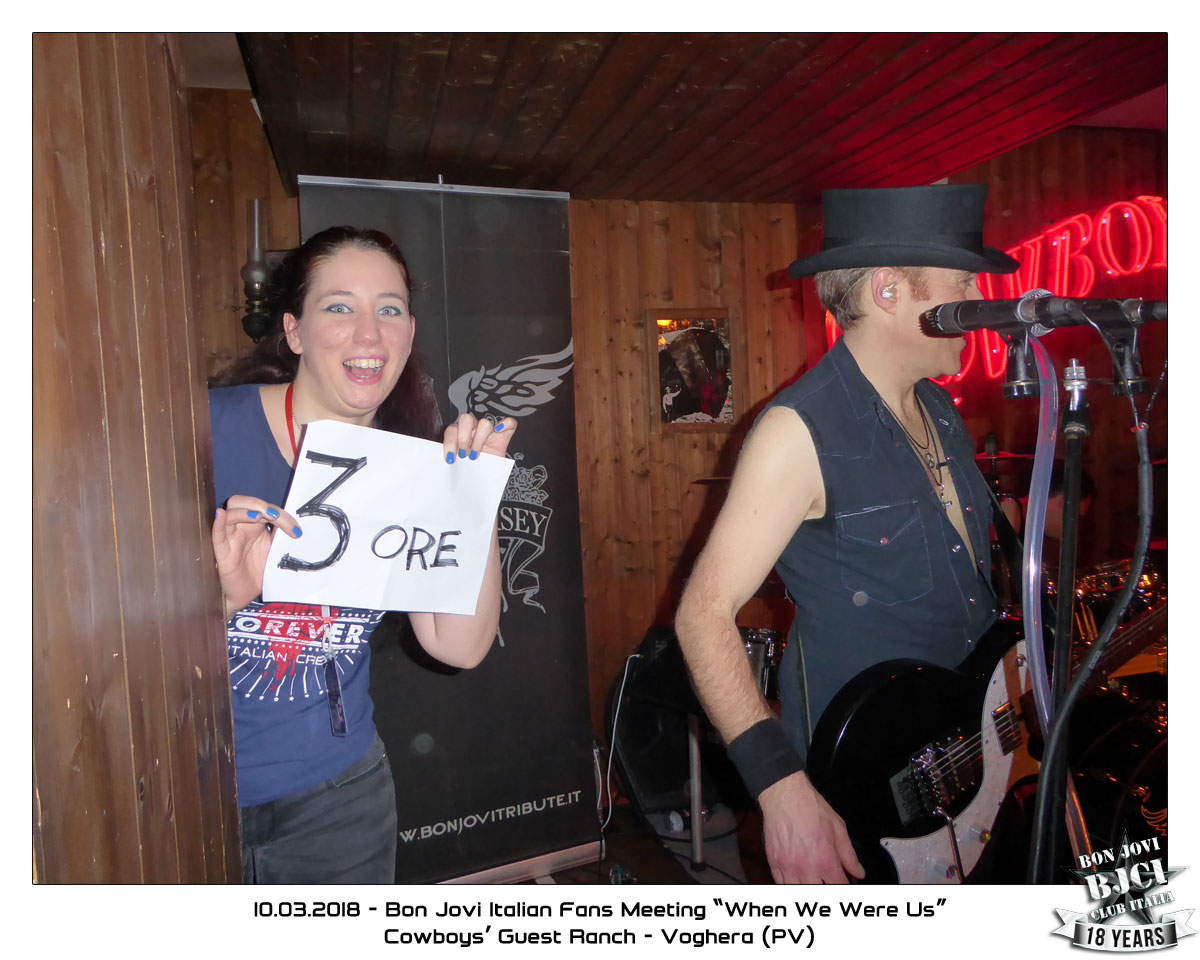 Il 10 marzo 2018 si ricorderà per tanto tempo! Questo Fans Meeting per celebrare il B-day di Jon e quest’anno anche l’introduzione dei Bon Jovi alla Rock n’Roll Hall Of Fame è stato davvero incredibile. Siamo tornati al Cowboys Guest Ranch di sabato sera e possiamo dirlo senza esitazioni: è stato un successo! Con il Saloon praticamente pieno a tappo e un atmosfera davvero calda in un ambiente incredibilmente bonjoviano, dove anche l’ultima persona in fondo al Saloon saliva sui tavoli a cantare e saltare!